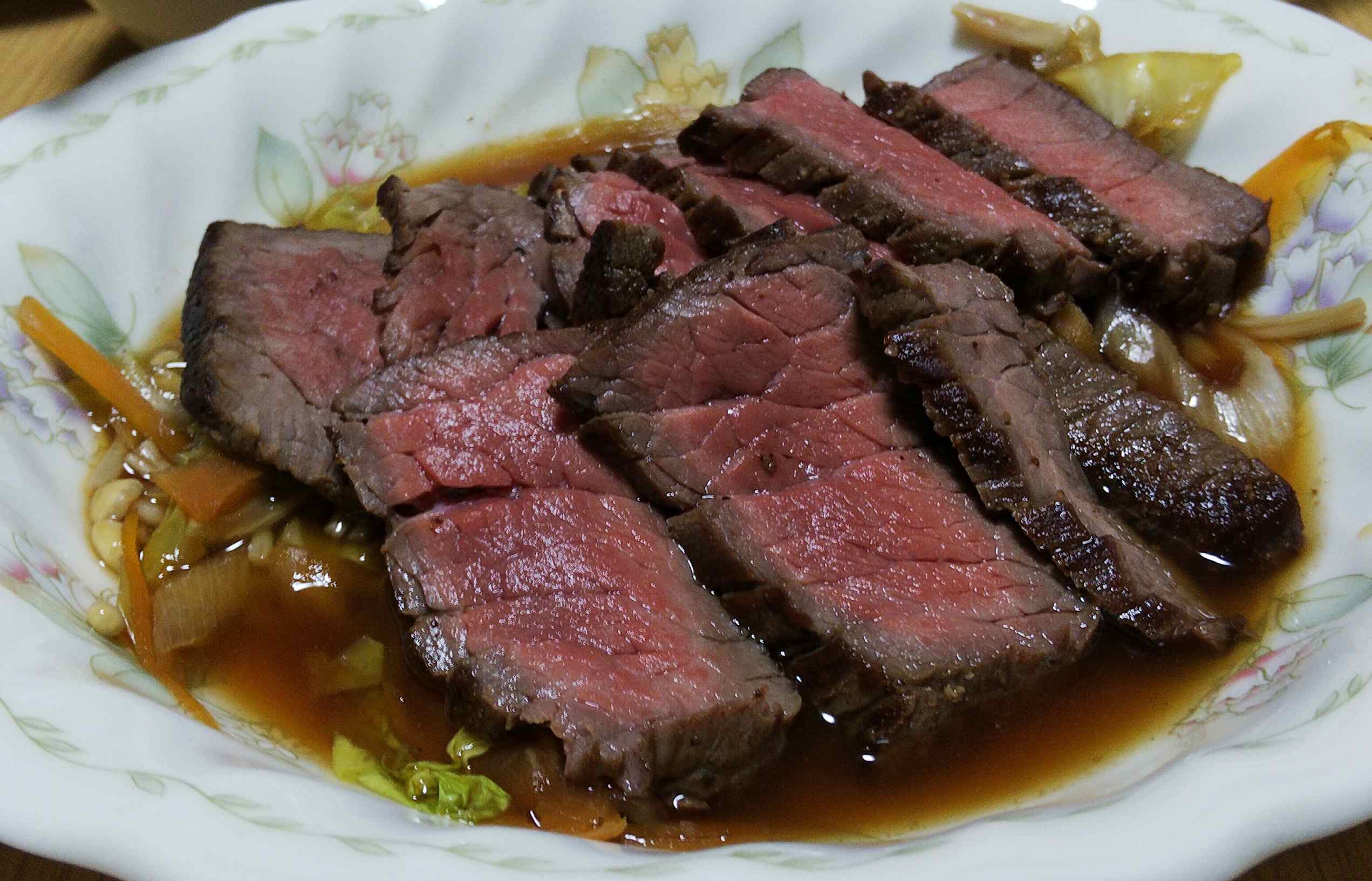 牛ももなので、分厚くカットしたら噛みきれず食べるのが大変でした。