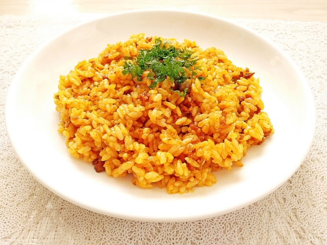 カレーピラフ:カレー風味の具材と一緒にお米を炊き込む